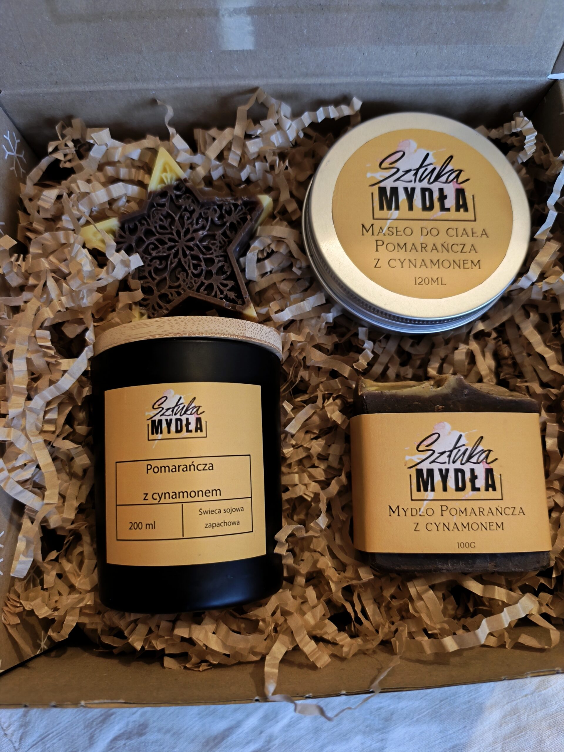 Zestaw Premium „Pomarańcza z Cynamonem” – Świeca Sojowa, Masło do Ciała, Mydło + Gwiazdka